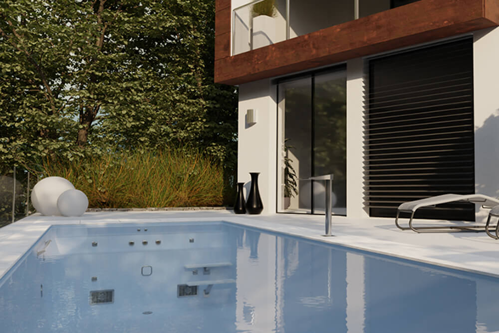 Optional kann der Pool mit einer Rollladenverkleidung ausgestattet werden, welche eine edle Sitzgelegenheit im Wasser bietet und ebenfalls in einer hochwertigen Corian-Edelstahl Ausführung verfügbar ist. Empfehlenswert ist zudem der praktische Modulschacht (LEIPO MCS System) – eine geräumige Technikschacht-Lösung direkt beim Pool. Der Swimmingpool kann je nach Bedarf ganz unterschiedlich gestaltet werden. Lassen Sie sich von den vielfältigen Ausstattungsoptionen begeistern!