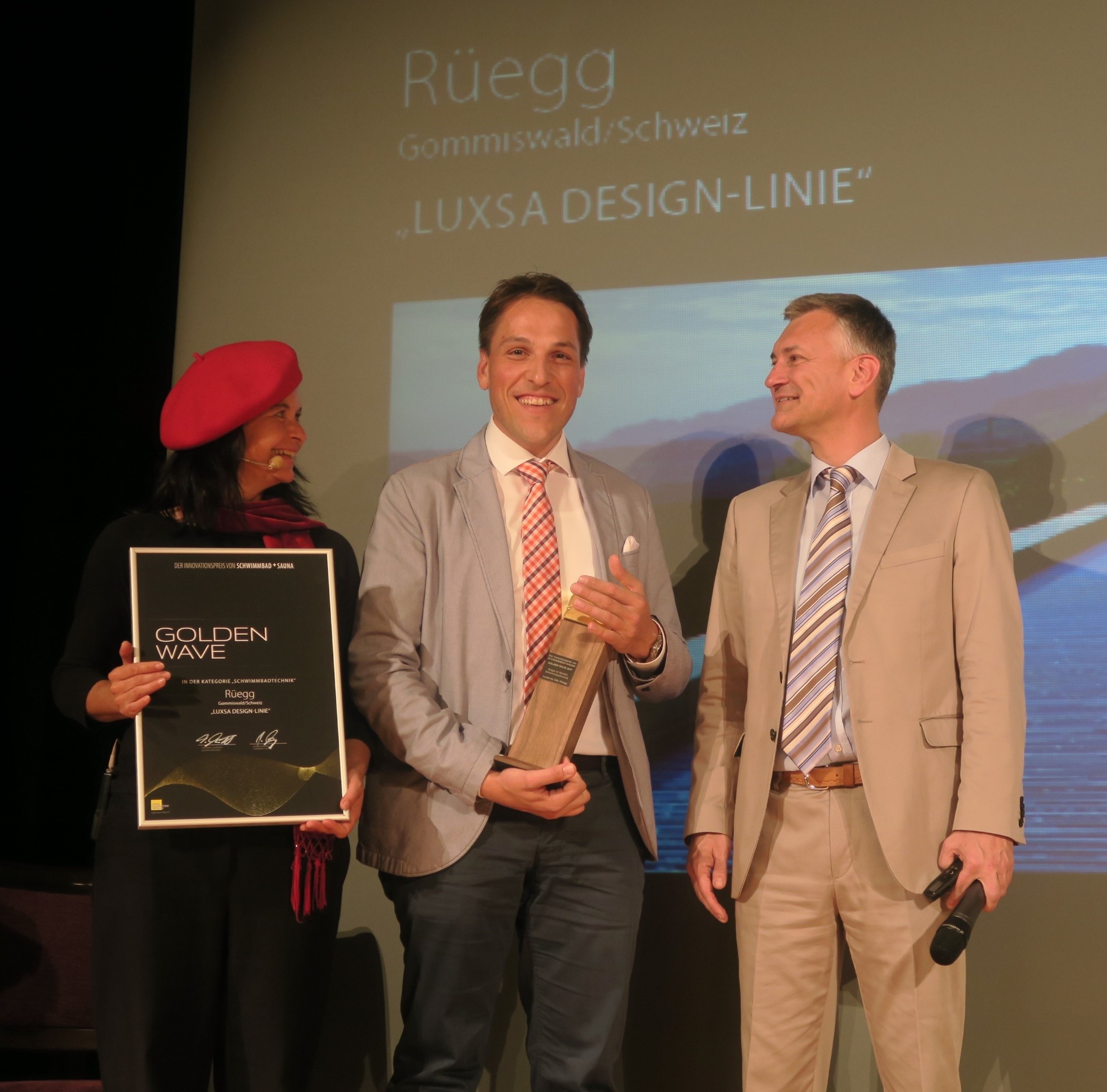 Lukas Rüegg konnte am Donnerstag, 30. März 2017, für LUXSA® den Golden Wave Award 2017 in Stuttgart entgegennehmen. Europas grösstes Pool & Spa Magazin Schwimmbad + Sauna zeichnet, mit einer 7-köpfigen Fachjury, mit diesem Award alle zwei Jahre Innovationen in der Branche aus. Mit den Schwimmbad Armaturen von LUXSA® steht erstmals ein komplettes Sortiment zur Verfügung, das mit Funktionalität, Design und neuem Montagesystem überzeugt.