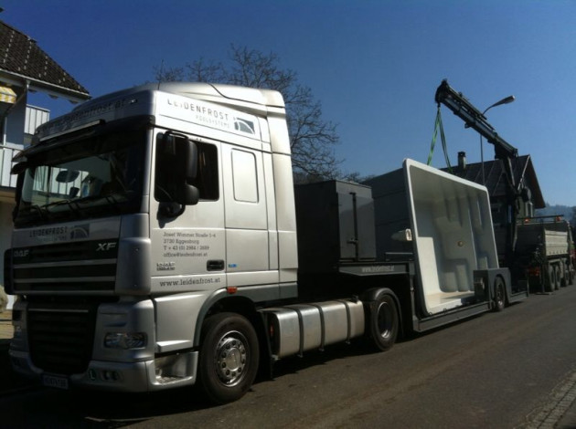 Unser Ausstellungsbad Leidenfrost Grado 710 hat einen neuen Besitzer. Der Pool wurde gestern per Camion dem neuen Eigentümer überbracht und montiert. Heute wird gebadet!